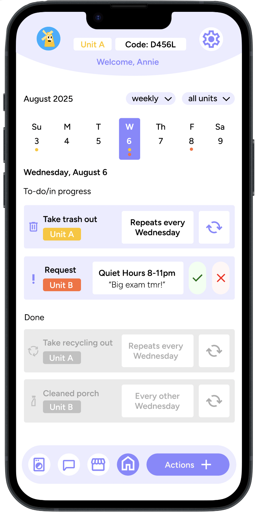 Neighborly is a task-driven app for people living in shared spaces, like duplexes, split-level homes, or apartments, who may not know each other. It helps coordinate household tasks, encourage casual communication, and build trust through borrowing, scheduling, and a built-in Neighbor Marketplace for buying or selling items.